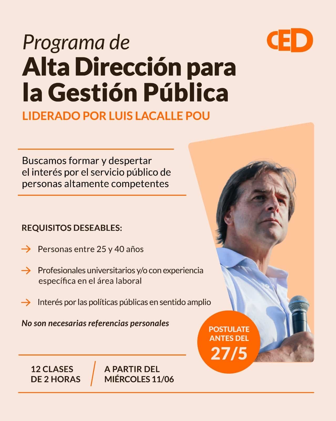El expresidente Luis Lacalle Pou liderará a partir del 11 de junio un curso de 12 clases titulado «Programa de alta dirección para la gestión pública» en el marco de su nuevo cargo como «senior fellow» en el Centro de Estudios para el Desarrollo (CED).Los requisitos «deseables» de los postulantes es que sean personas de entre 25 y 40 años con títulos universitarios o «experiencia específica en algún área profesional o laboral». Además, se apunta a personas que tengan «interés por las políticas públicas en un sentido amplio, preferentemente con alguna especialización teórica o práctica».