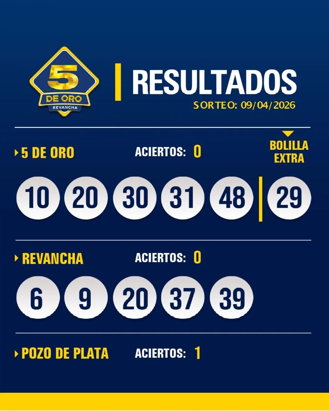 Les compartimos los resultados del sorteo del 5 de Oro con Revancha del día 09 de abril de 2026.