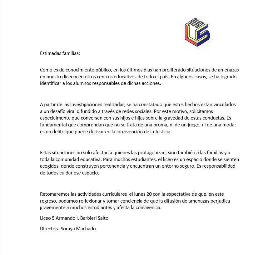 Liceo 5 de Salto retoma actividades este lunes» a los padres y madres conversen con sus hijos sobre la gravedad de amenazas» Abr 19, 2026 Quinto Elemento