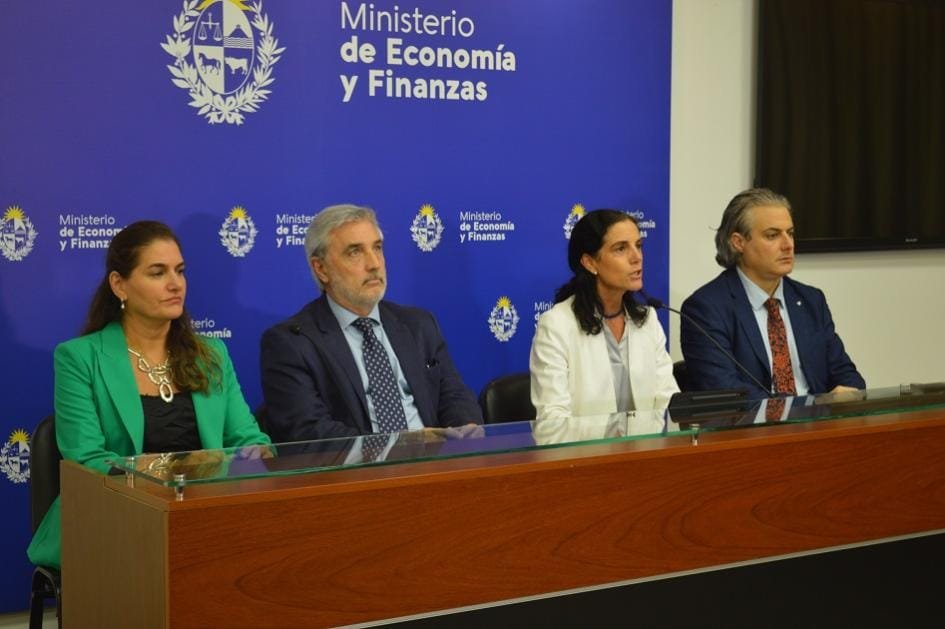 Arbeleche explicó que obtener una mejor nota crediticia implica un menor costo de financiamiento para Uruguay, que tiene un riesgo país de 78 puntos básicos de acuerdo al índice de JPMorgan, lo cual refleja un “hito histórico”, destacó, acompañada por el subsecretario, Alejandro Irastorza; y los directores de Política Económica, Marcela Bensión, y de la Unidad de Gestión de Deuda, Herman Kamil.