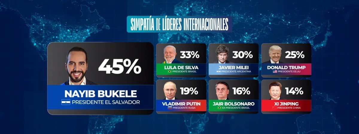 En las preferencias de los uruguayos, luego de Bukele aparecen el expresidente de Brasil, Jair Bolsonaro, con 16%; el presidente de China, Xi Jinping, con 14% y el presidente del Gobierno español, Pedro Sánchez, recoge un 11% de simpatía; la mexicana Claudia Sheinbaum y el mandatario colombiano Gustavo Petro con 10%; además, la presidenta interina de Venezuela, Delcy Rodríguez, y la expresidenta argentina Cristina Fernández de Kirchner con 7%; el recientemente asumido mandatario de Chile, José Antonio Kast, con 5%. Por último, en la lista figura el depuesto venezolano Nicolás Maduro con 3%.