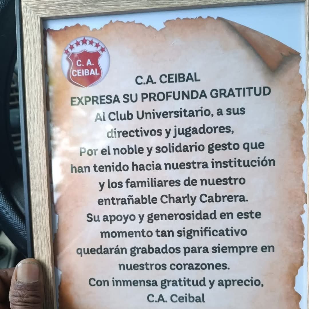 Ceibal les entregó un pergamino , dónde además de agradecer a la institución universitario ,destaca la nobleza y solidaridad en estos momentos tan duros ,con el Club y la familia de Charly