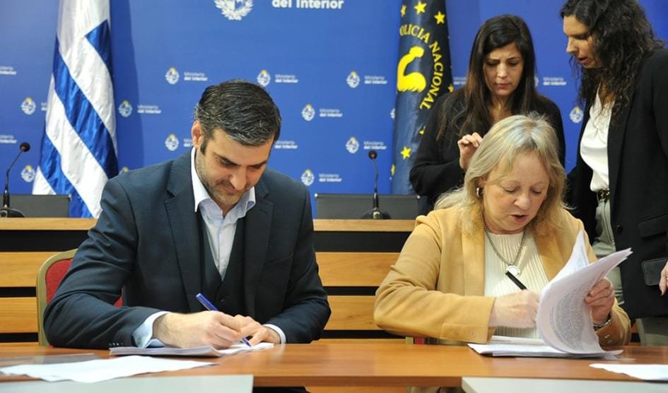 El ministro del Interior, Nicolás Martinelli, y la presidenta de la UTE, Silvia Emaldi, suscribieron, este miércoles 27, en la sede de la referida cartera, un convenio para ejecutar obras a los efectos de suministrar electricidad al nuevo módulo del INR en el penal de Libertad, en San José. También participaron el subsecretario del primer organismo citado, Pablo Abdala, y el vicepresidente del segundo, Pablo Ferrari, entre otros representantes de ambas instituciones.