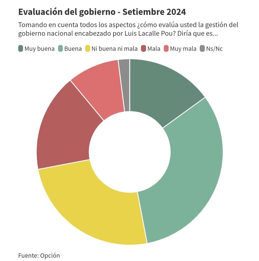 En detalle, el 15% de los uruguayos dijo que la gestión del gobierno encabezado por Luis Lacalle Pou es «muy buena», el 32% dijo que es «buena, el 25% dijo que no es ni buena ni mala, el 17% dijo que es «mala», el 9% dijo que es «muy mala» y el 2% restante dijo no saber o prefirió no contestar.