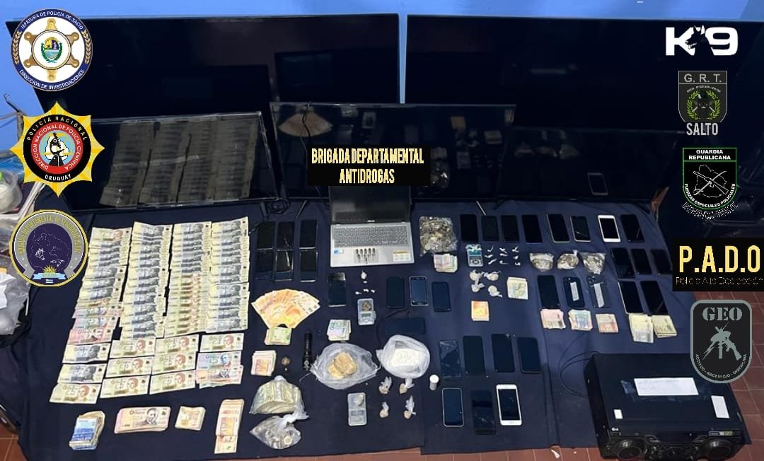 Incautaciones: Varios envoltorios de diferentes tamaños con diferentes sustancias. 2 balanzas de precisión, 34 celulares, una notebook, un equipo de música, Municiones cal 22 y 9 mm, 5 TV, 1 hidrolavadora, 2 cascos, 1 auto y 7 motos, prendas de procedencia extranjera, dinero extranjero: 102 dólares americanos, y 100.190 pesos argentinos. Dinero nacional: 247.148 pesos uruguayos.