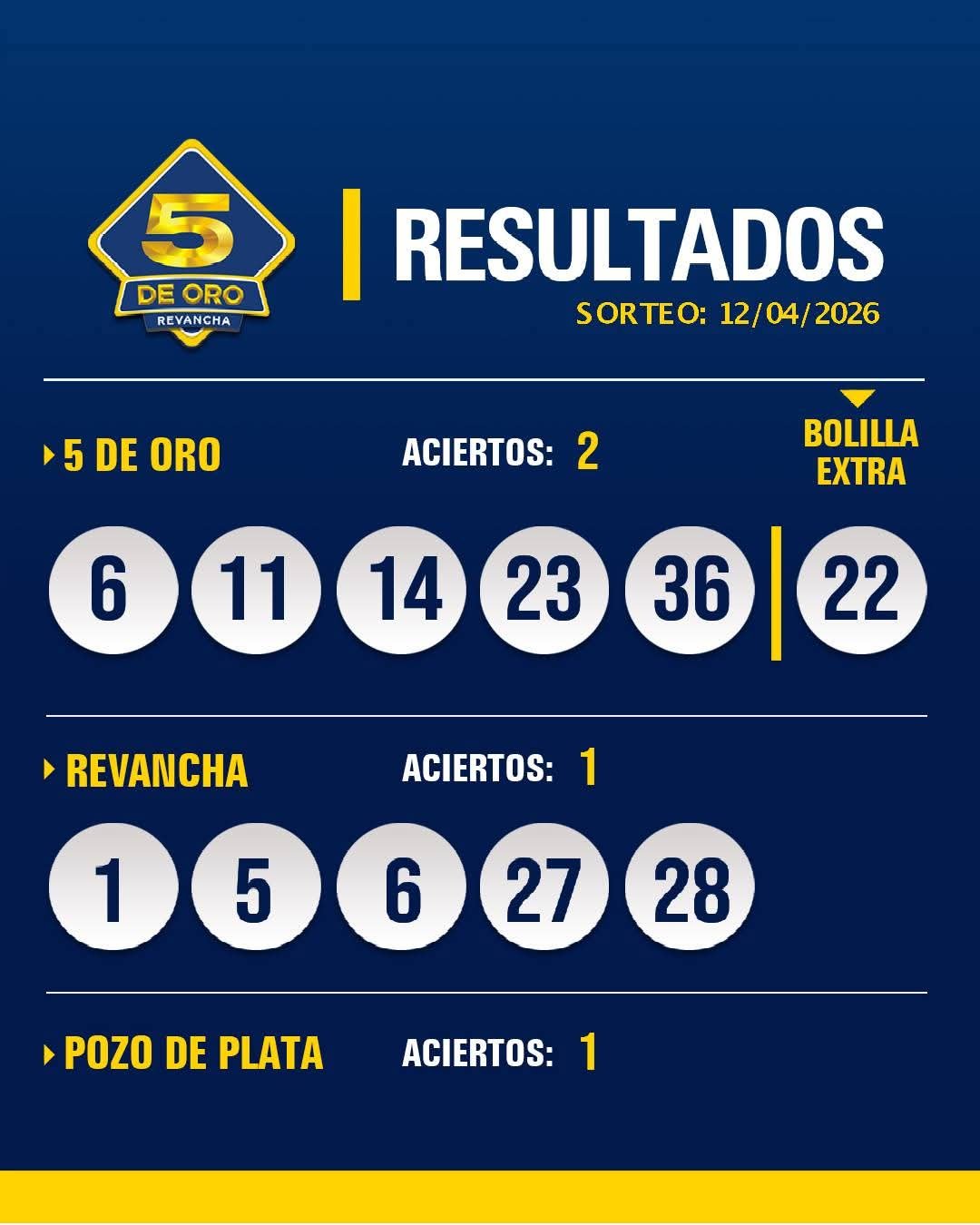 Les compartimos los resultados del sorteo del 5 de Oro con Revancha del día 12 de abril de 2026.
