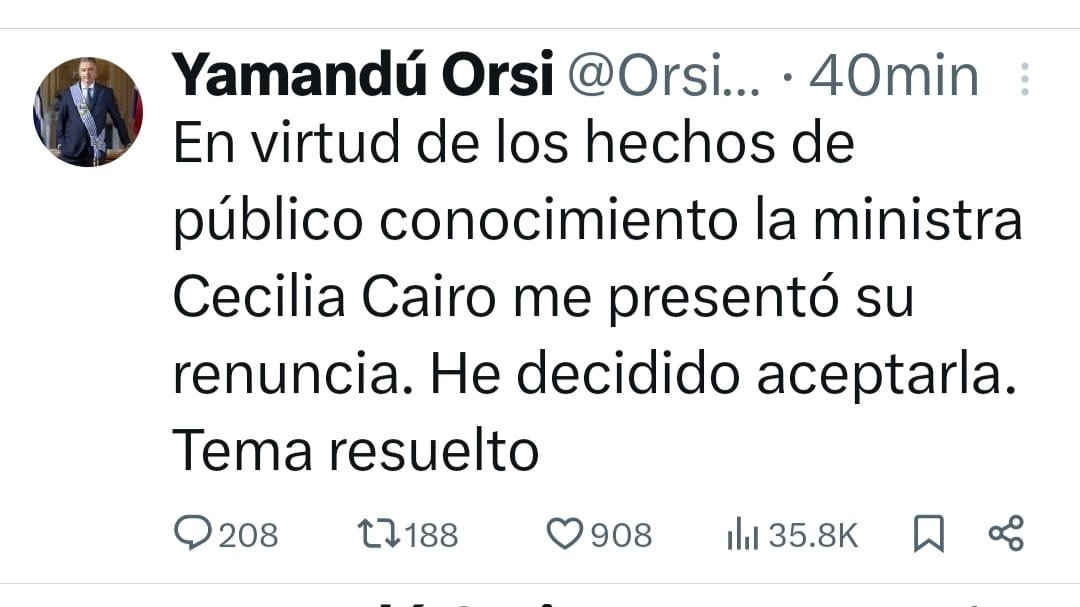 Un viernes Santo tremendo y de paz y amor muy poco , donde el Presidente Yamandú Orsi acaba de postear en su red X , la aceptación de la renuncia de la ex ministra de vivienda Cecilia Cairo. Senadora del MPP Frente Amplio. Una renuncia exigida no solo desde la oposición sino desde cada ciudadano y ciudadana ,que no pudo justificar algo tan simple ,como la construcción de 4 viviendas sin declarar en Catastro ,entre otras cosas.