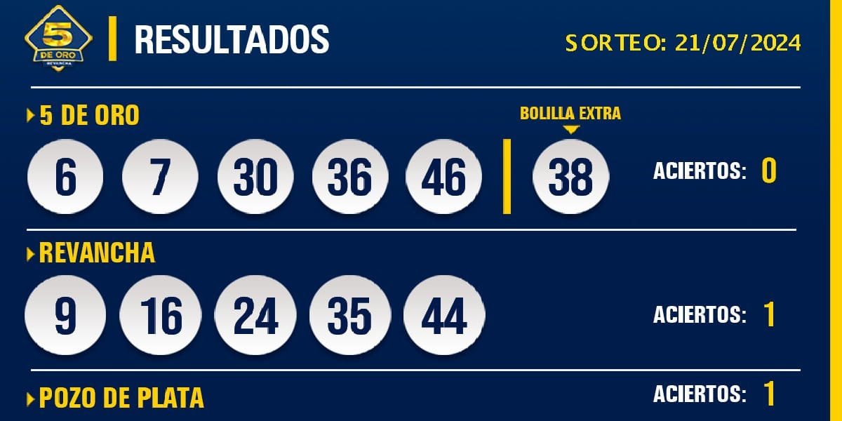 Les compartimos los resultados del sorteo del 5 de Oro con Revancha del día 21 de julio de 2024.
