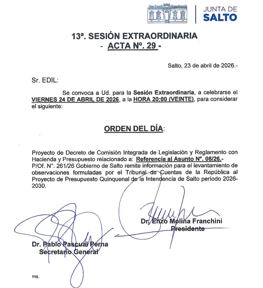 Presupuesto Quinquenal: la Junta Departamental de Salto convoca sesión extraordinaria para viernes 24 hora 20 Abr 23, 2026 Quinto Elemento