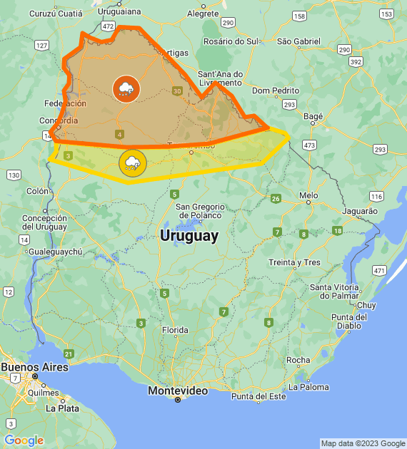 Descripción: Frente semi-estacionario afecta el país, generando tormentas algunas puntualmente fuertes. Cabe destacar que en zonas de tormentas se podrán registrar lluvias intensas en cortos períodos, ocasional caída de granizo, intensa actividad eléctrica y rachas de viento muy fuertes. Se continuará monitoreando la situación y se informará ante eventuales cambios.