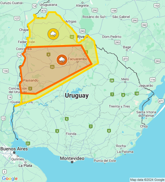 Descripción: Perturbación atmosférica asociada a masa de aire húmeda e inestable afecta el país, generando tormentas algunas puntualmente fuertes y/o severas. Cabe destacar que en zonas de tormentas se podrán registrar lluvias copiosas en cortos períodos, caída de granizo, intensa actividad eléctrica y rachas de vientos muy fuertes. Se continuará monitoreando la situación y se informará ante eventuales cambios.