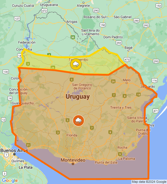 Descripción: Perturbación atmosférica asociada a masa de aire húmeda e inestable afecta el país, generando tormentas algunas puntualmente fuertes. Cabe destacar que en zonas de tormentas se podrán registrar intensa actividad eléctrica acompañadas de lluvias abundantes en cortos períodos, ocasional caída de granizo y rachas de vientos fuertes. Se esperan mejoras temporarias durante la validez de la alerta. Se continuará monitoreando la situación y se informará ante eventuales cambios.