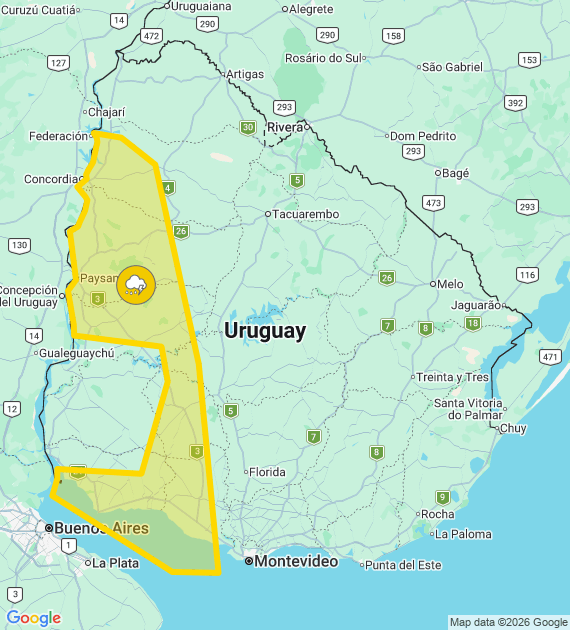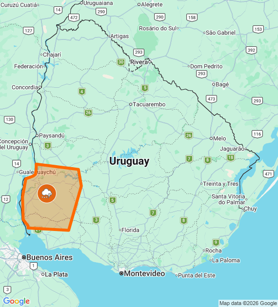 Descripción: Actividad pre-frontal comienza a afectar el país, generando tormentas algunas puntualmente fuertes y/o severas. Cabe destacar que en zonas de tormentas se podrán registrar lluvias abundantes en cortos períodos, ocasional caída de granizo, intensa actividad eléctrica y rachas de vientos muy fuertes. Se continuará monitoreando la situación y se informará ante eventuales cambio