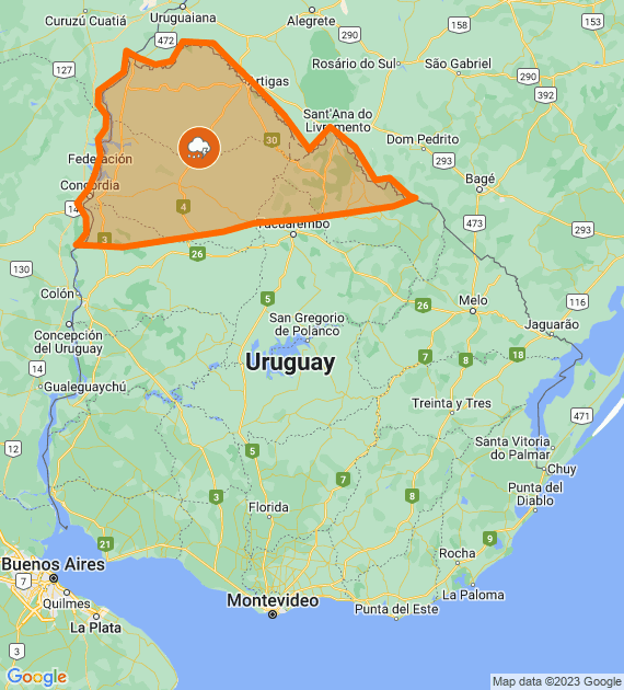 Descripción: Perturbación atmosférica asociada a masa de aire húmeda e inestable afecta el país, generando tormentas algunas puntualmente fuertes. Cabe destacar que en zonas de tormentas se podrán registrar lluvias intensas en cortos períodos, caída de granizo, intensa actividad eléctrica y rachas de viento muy fuertes. Se continuará monitoreando la situación y se informará ante eventuales cambios.
