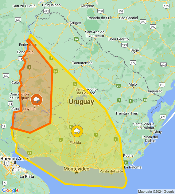 Descripción: Perturbación atmosférica asociada a masa de aire húmeda e inestable afecta el país, generando tormentas algunas puntualmente fuertes y/o severas. Cabe destacar que en zonas de tormentas se podrán registrar lluvias (abundantes /copiosas) en cortos períodos, caída de granizo, intensa actividad eléctrica y rachas de vientos muy fuertes. Se continuará monitoreando la situación y se informará ante eventuales cambios.