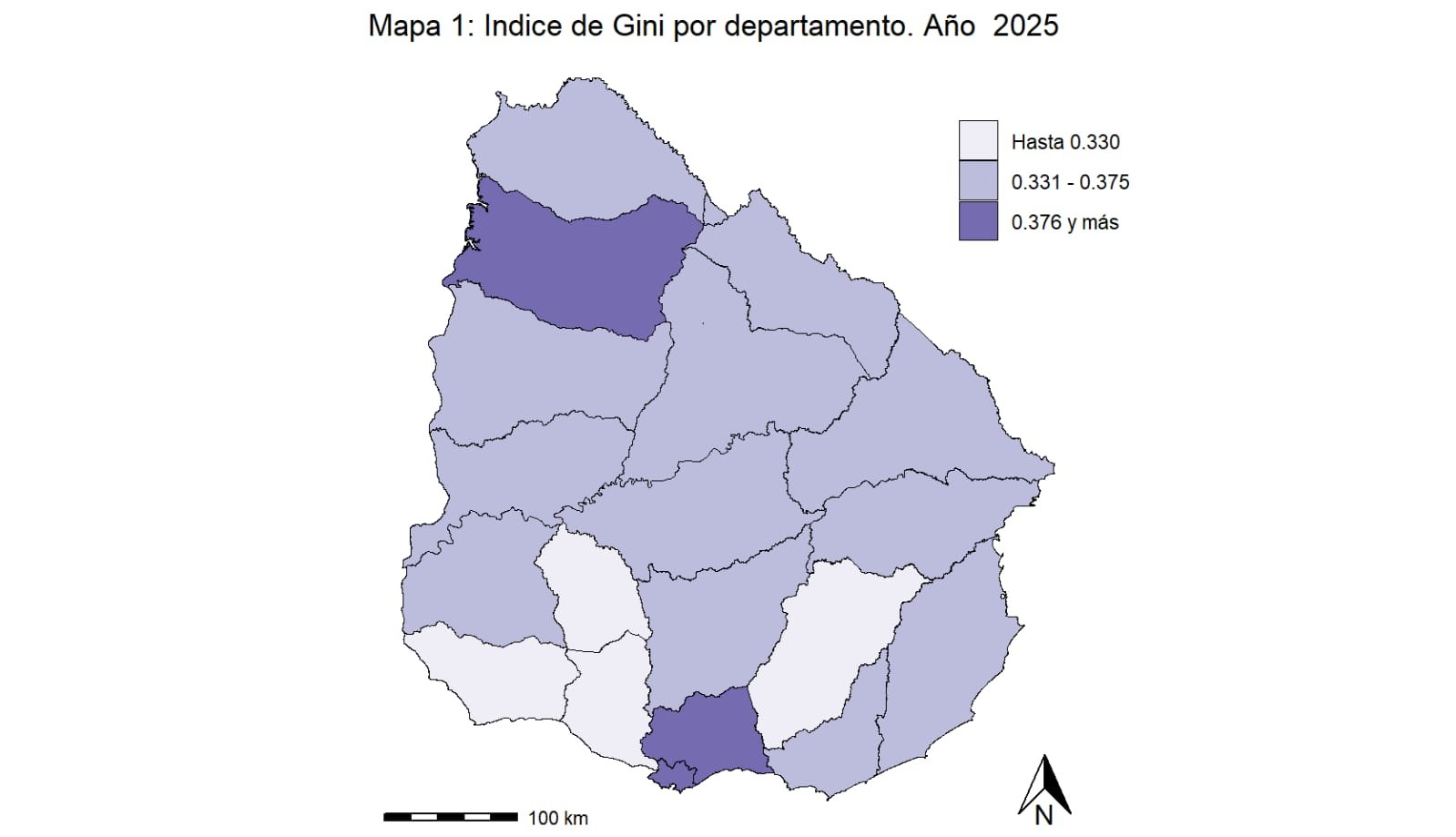 El análisis del coeficiente de Gini por departamento permite observar que Montevideo, Salto y Canelones son los departamentos con mayor nivel de desigualdad. Por su parte, los departamentos de San José, Colonia, Lavalleja y Flores son los que presentan los menores niveles.