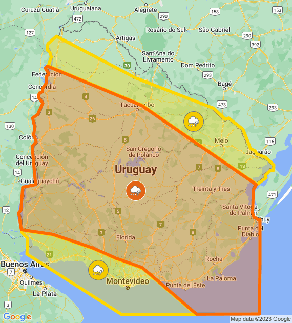 Descripción: Perturbación atmosférica asociada a masa de aire húmeda e inestable afecta el país, generando tormentas algunas puntualmente fuertes y severas. Cabe destacar que en zonas de tormentas se podrán registrar lluvias copiosas en cortos períodos, ocasional caída de granizo, intensa actividad eléctrica y rachas de viento muy fuertes. Se continuará monitoreando la situación y se informará ante eventuales cambios.
