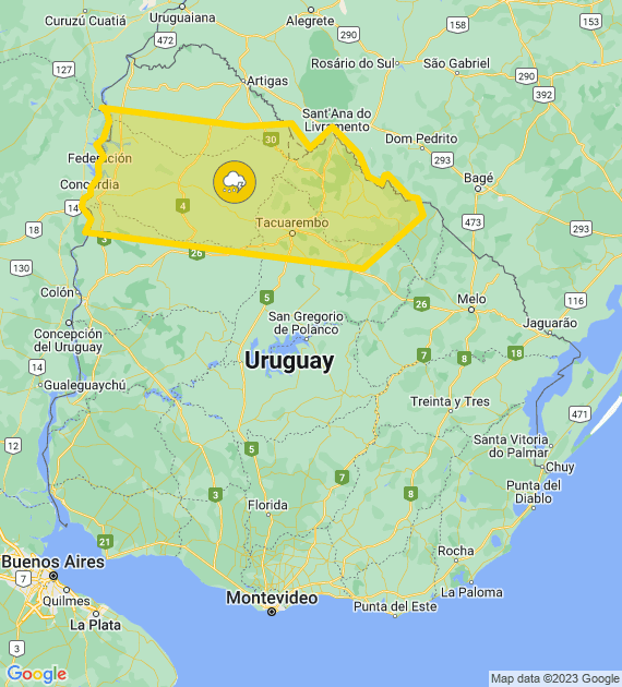 Descripción: Perturbación atmosférica asociada a masa de aire húmeda e inestable afecta el país, generando tormentas algunas puntualmente fuertes. Cabe destacar que en zonas de tormentas se podrán registrar lluvias intensas en cortos períodos, ocasional caída de granizo, intensa actividad eléctrica y rachas de viento fuertes. Se continuará monitoreando la situación y se informará ante eventuales cambios.