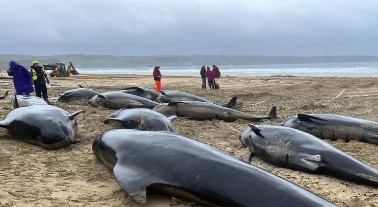 Se trata del peor varamiento masivo de ballenas en la zona. Biólogos marinos tratan de determinar qué pasó con las 55 ballenas que quedaron varadas y murieron, este domingo, en una playa de la Isla de Lewis, en la costa oeste de Escocia. Todas menos una fallecieron de forma natural o tuvieron que ser sacrificadas.