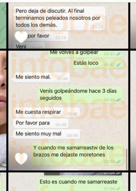 En las imágenes se puede ver a la ex primera dama con moretones en el brazo y la cara. Son fotos que ella le manda al ex mandatario reprochándole su actitud violenta: “Esto no funciona así todo el tiempo me golpeas. Es insólito. No puede dejar que me hagas esto cuando yo no te hice nada. Y todo lo que trato de hacer con la mente centrada es defenderte y vos me golpeas físicamente. No hay explicación”.