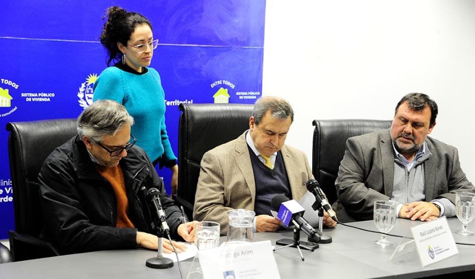 La firma del acuerdo se realizó este viernes 21 en la sede del MVOT. Además de Lozano, asistieron el subsecretario de la cartera, Tabaré Hackenbruch; el director nacional de Vivienda, Eduardo González, y el rector de la Udelar, Rodrigo Arim.