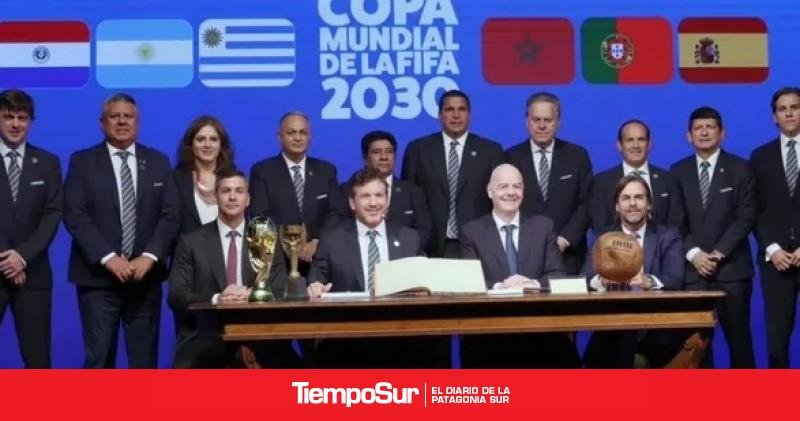 El presidente de la Federación Internacional de Fútbol Asociación (FIFA), Gianni Infantino y miembros de la Confederación Sudamericana de Fútbol (Conmebol) firmaron el libro que pauta los primeros juegos del Mundial correspondiente al año 2030.