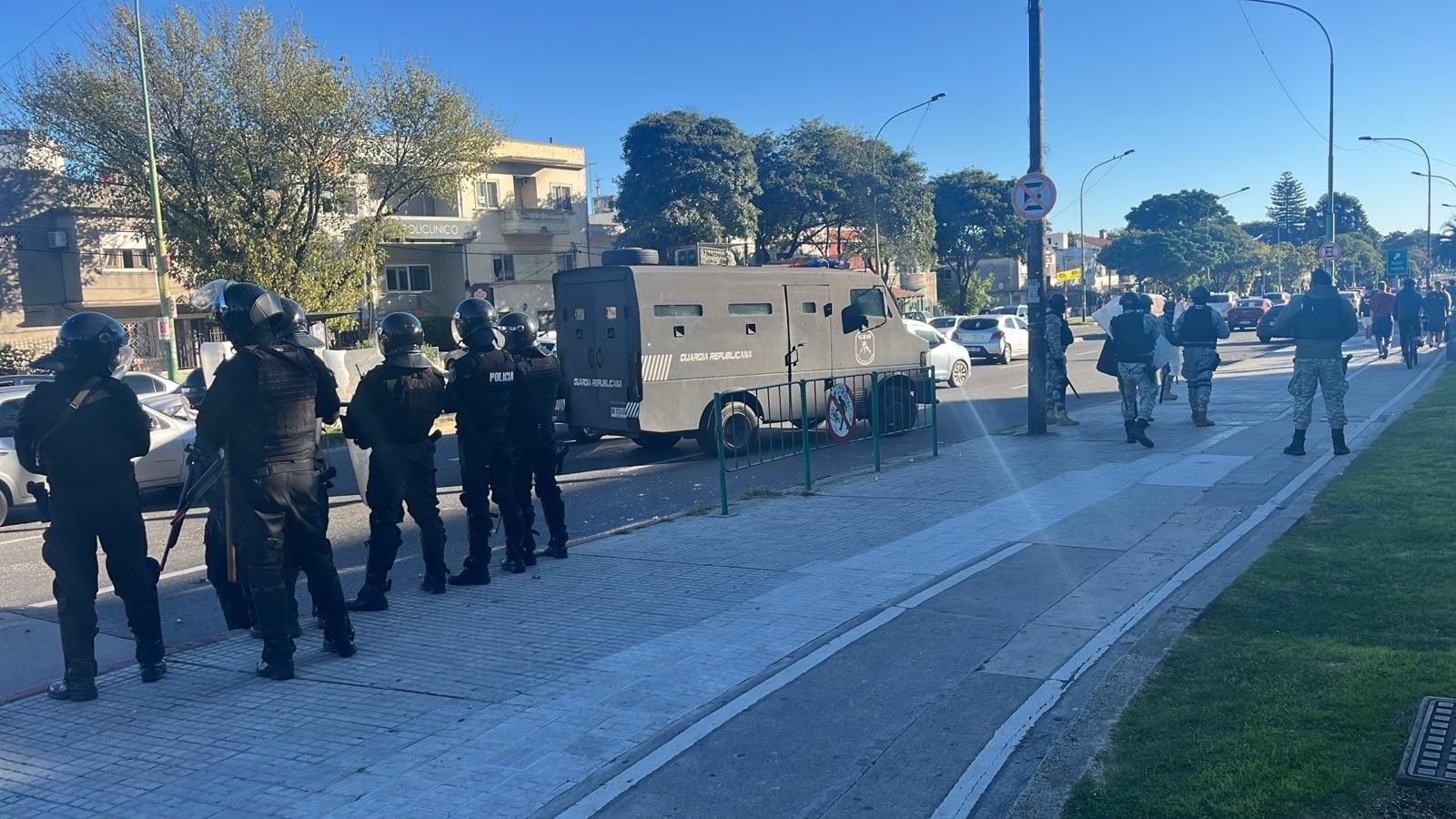 Producto de los disturbios que se generaron, la Policía montó un gran despliegue en la zona. Tuvo que intervenir la Guardia Republicana, policía a caballo, un grupo de choque. Para dispersar a los jóvenes, los efectivos utilizaron disparos con munición no letal y también el camión hidrante.