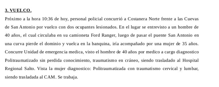 Es la información de policía de Salto.Comparte esta nota: Compartir en X (Twitter) Compartir en Facebook Compartir en Email Compartir en WhatsApp Navegación de entradasA 10 años del primer «Ni una menos»Fiscal reconoció que Marset ofreció entregarse y Justicia paraguaya rechazó la propuesta
